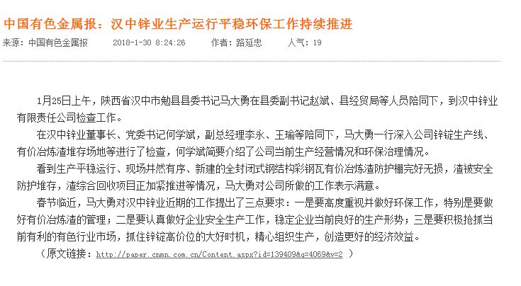 中國有色金屬報:漢中鋅業(yè)生產(chǎn)運行平穩(wěn) 環(huán)保工作持續(xù)推進